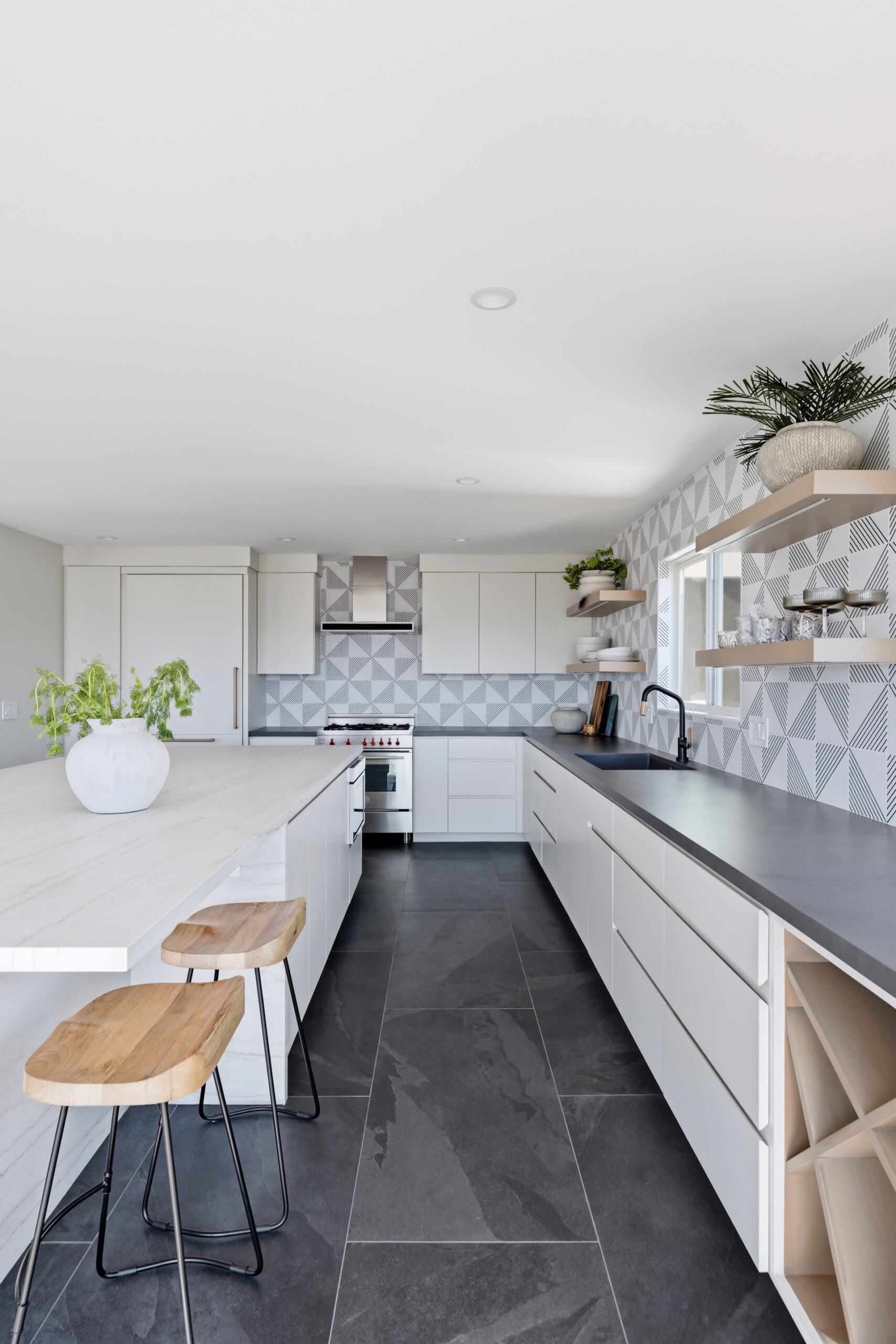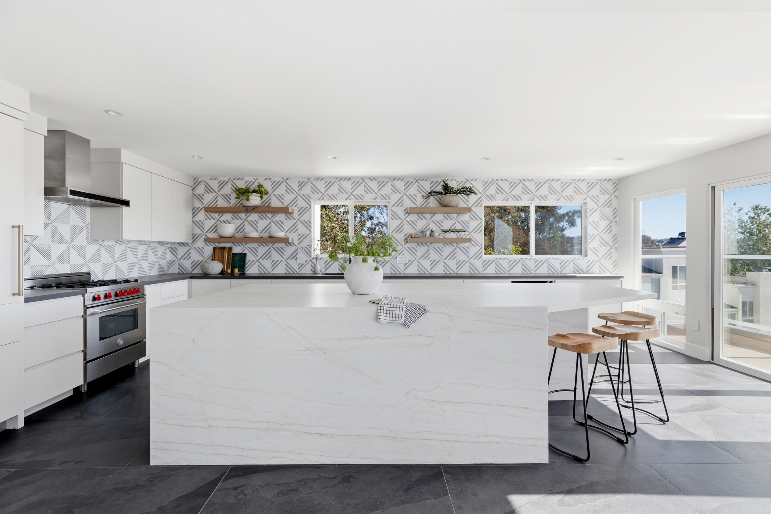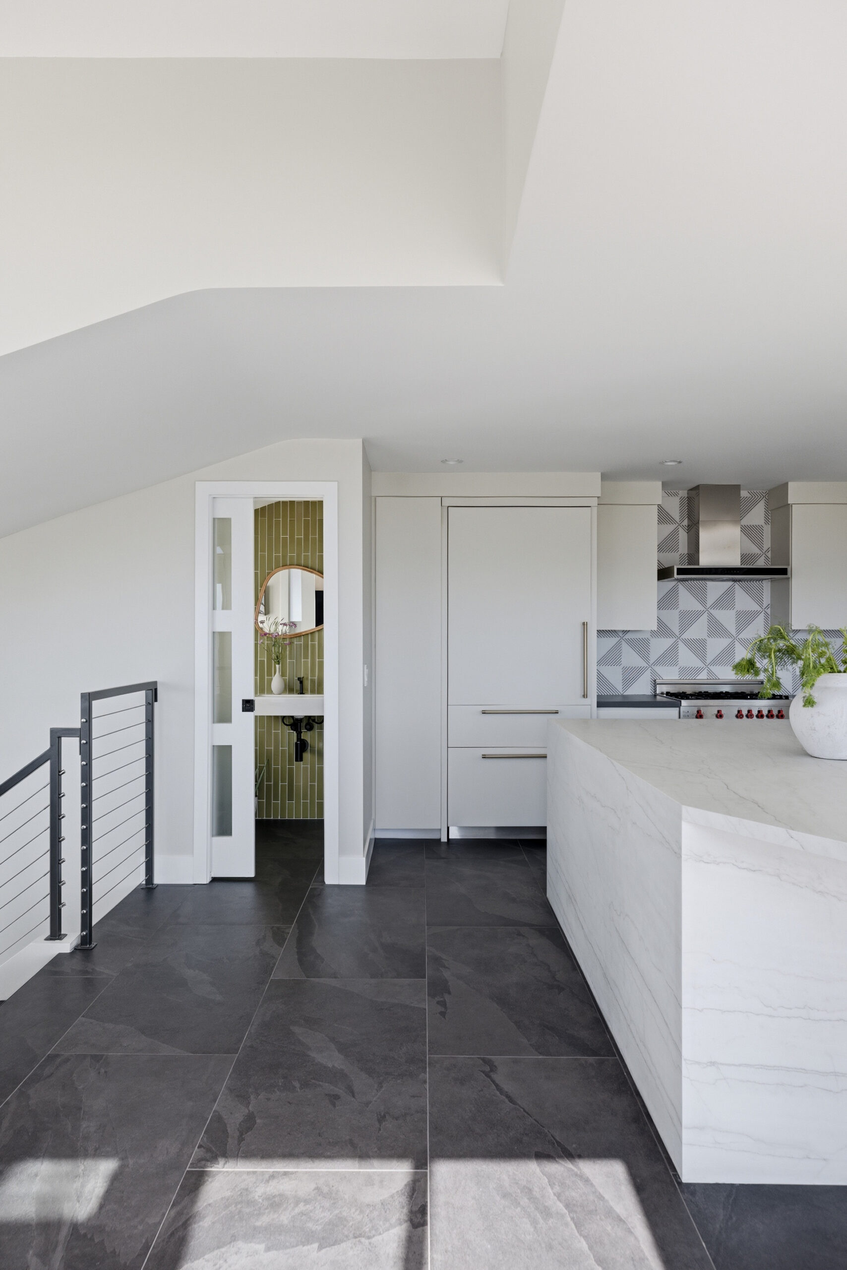 At the heart of the home, the kitchen was completely redesigned to maximize flow, light, and connection to the surrounding views. A standout feature is the impressive 15-foot custom island, purpose-built for both everyday living and entertaining. Clean lines, high-end finishes, and a cohesive material palette create a space that feels both modern and timeless.