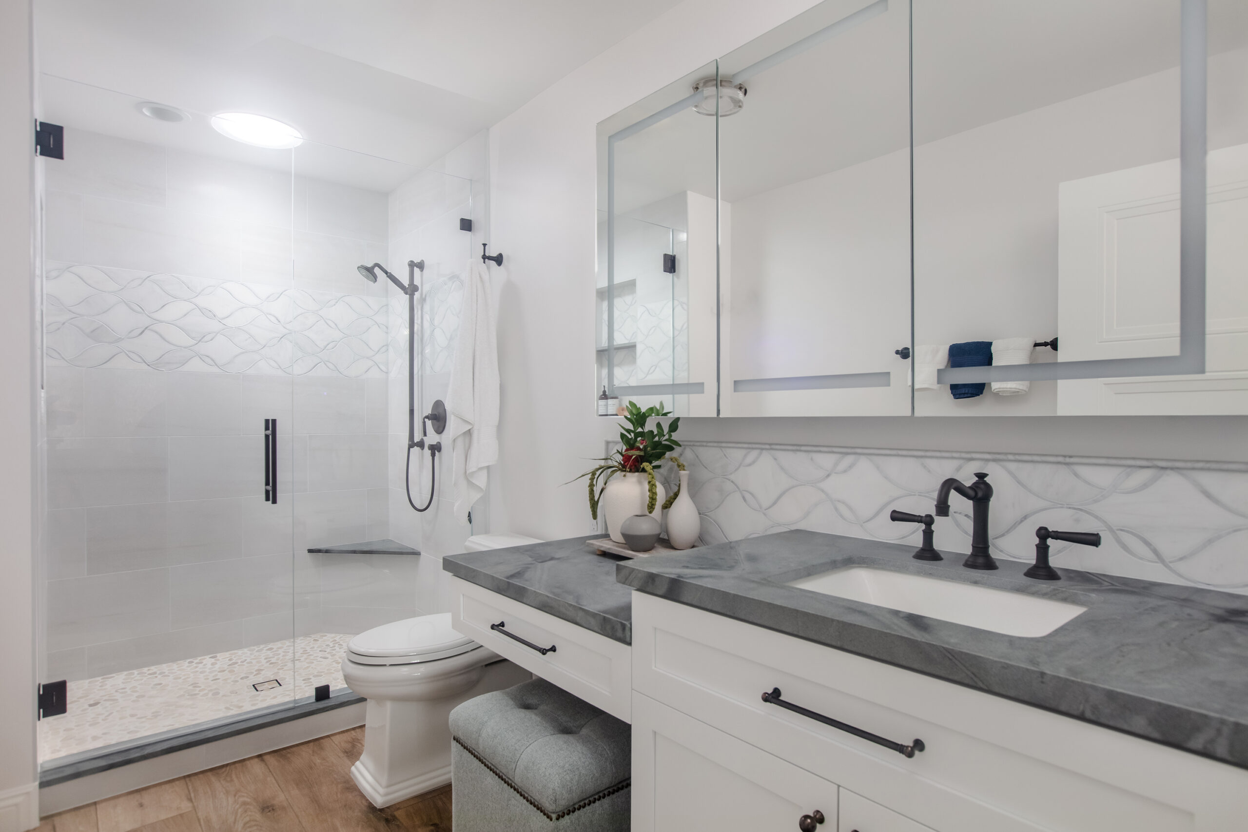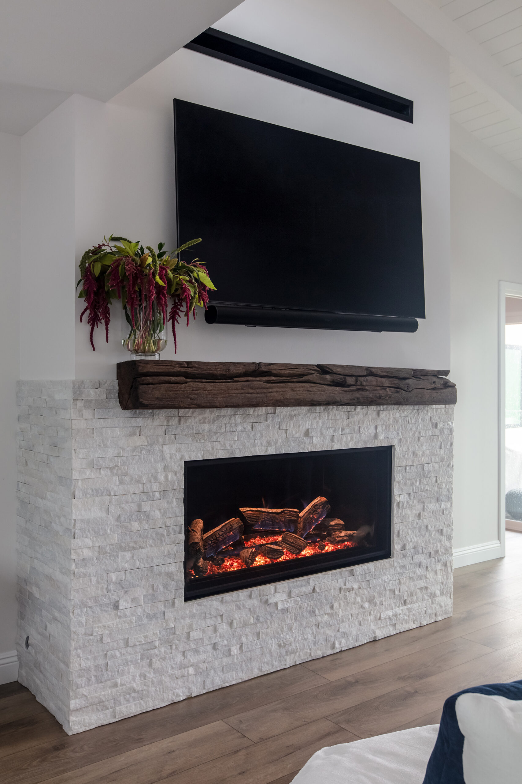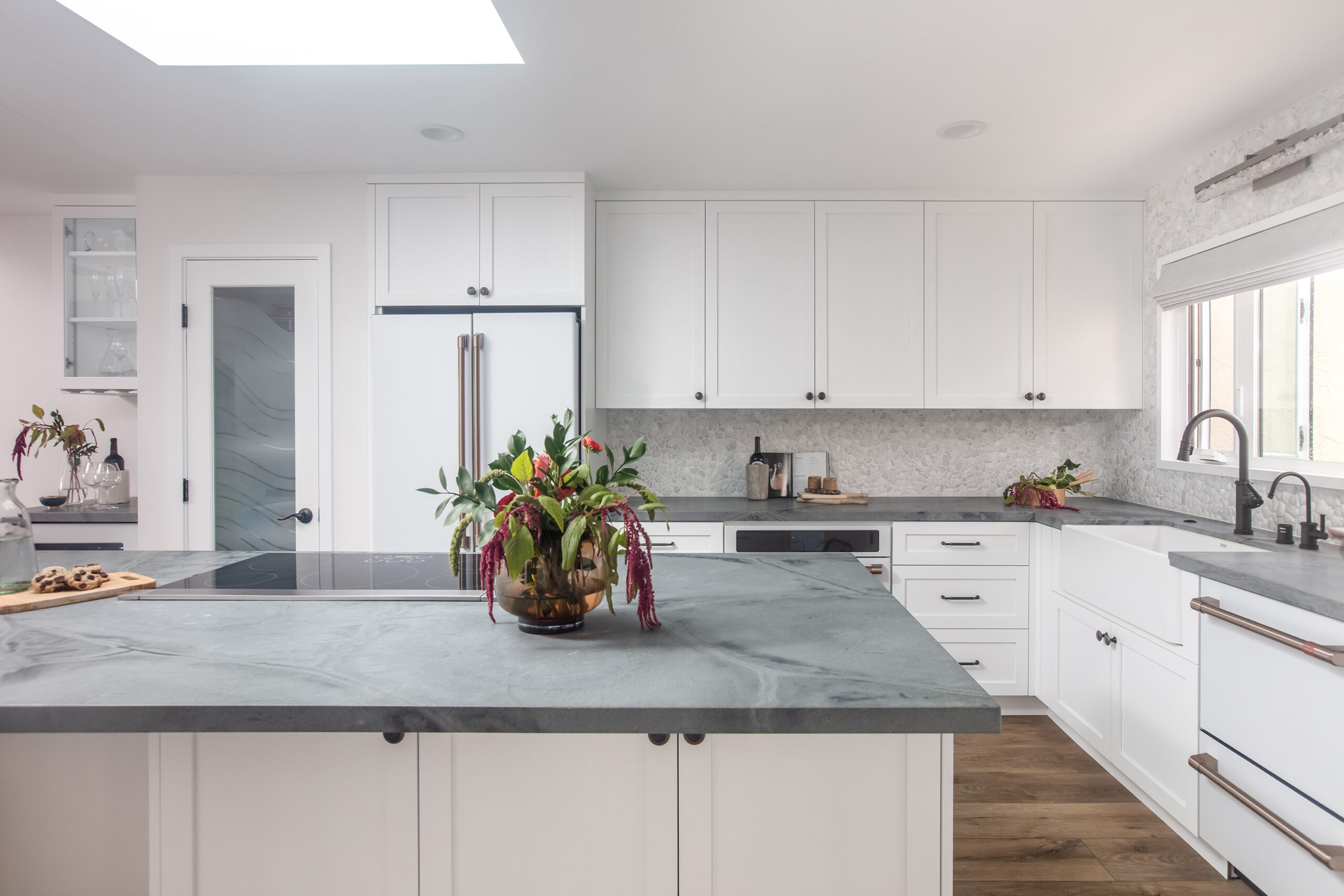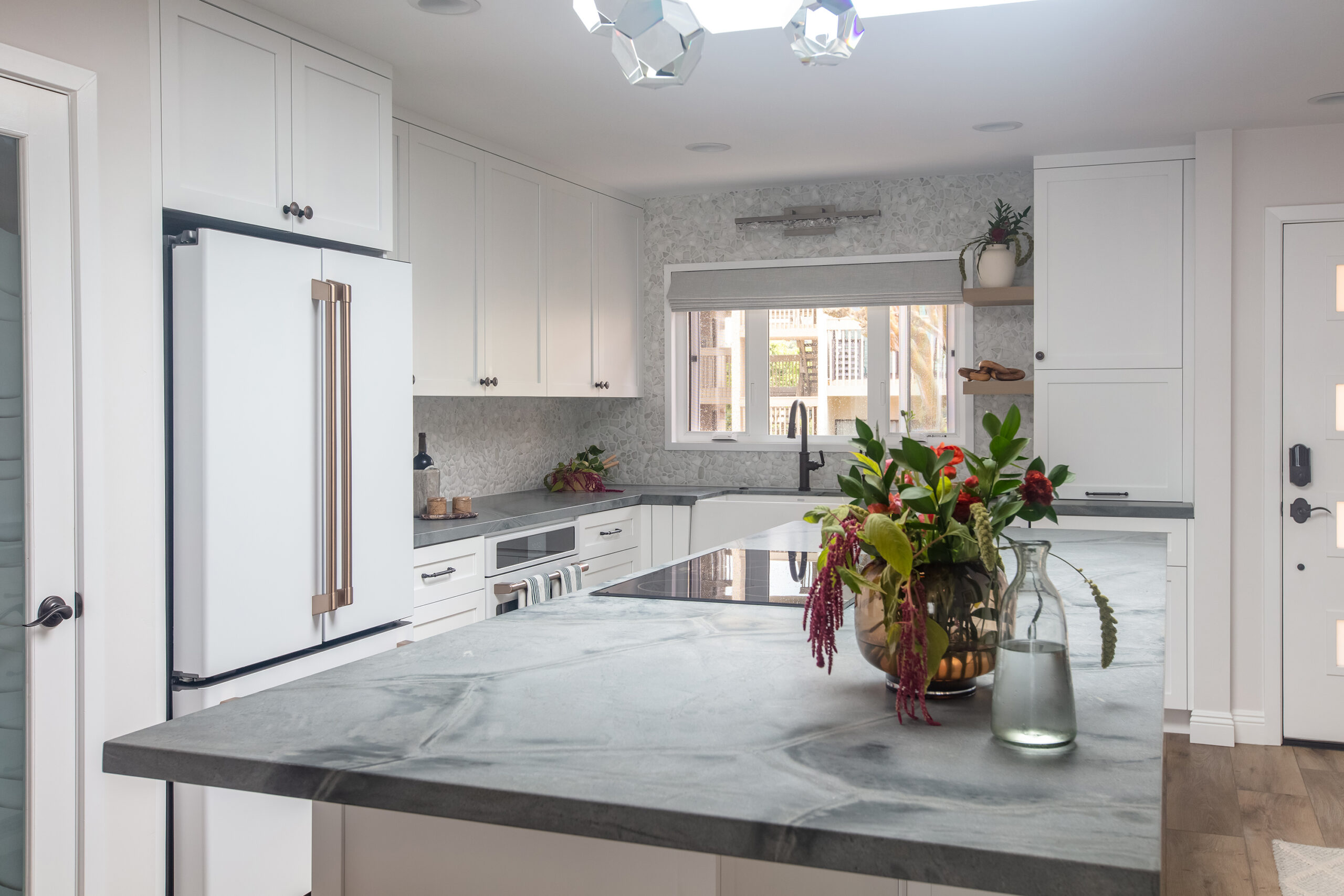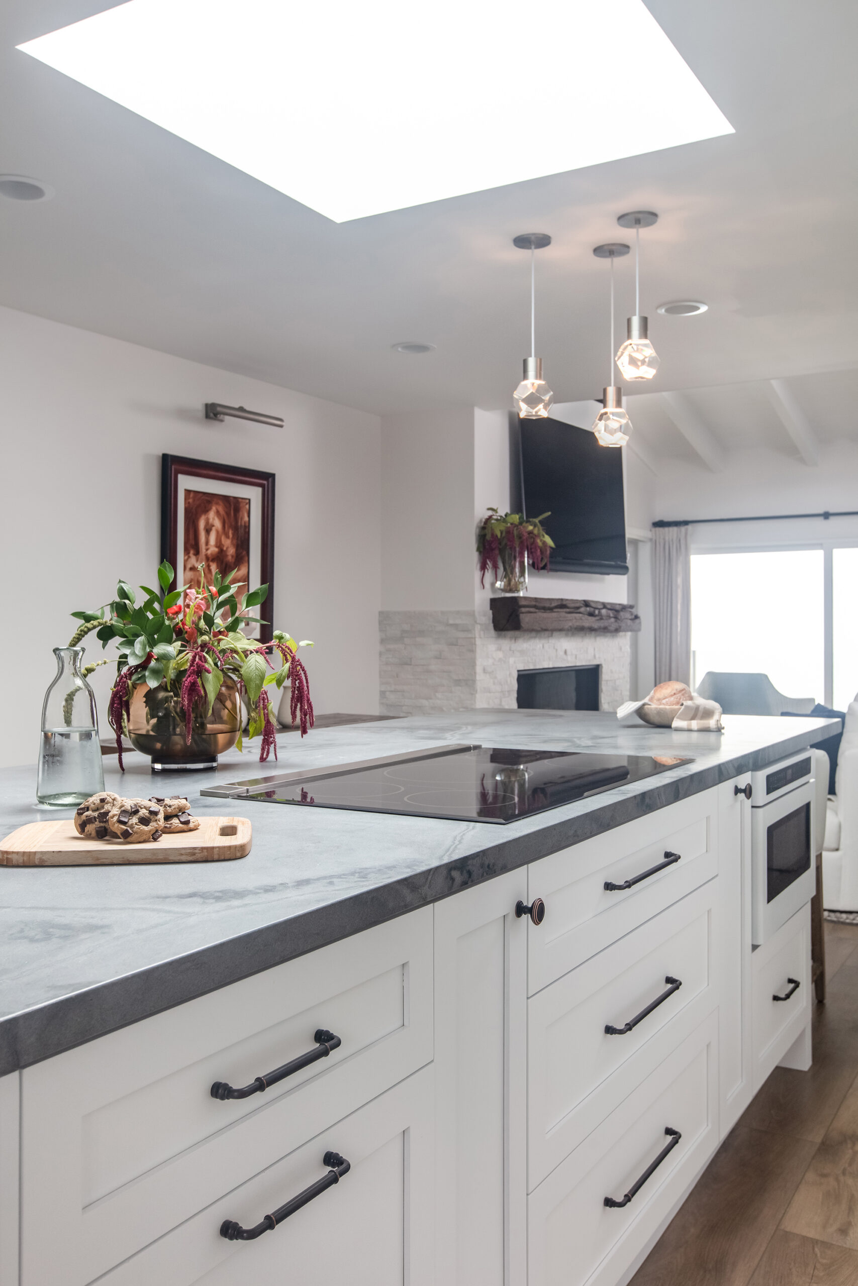 The remodel included a new kitchen, master bathroom, guest bathroom, and a custom fireplace that anchors the main living space. Each area was designed to strengthen the connection to the Pacific Ocean while maintaining a calm, refined interior feel.