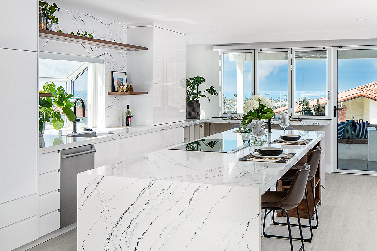 This Carlsbad townhome was transformed into a vacation-style retreat, where bright natural light fills every corner and textures add dimension and fun. Inspired by their favorite southern get-away spot, the design blends relaxed sophistication with thoughtful detailing, capturing the essence of a sun-soaked escape right at home. Large windows and folding door systems frame ocean views, while curated finishes and layered materials make the space feel inviting, airy, and effortlessly elegant.